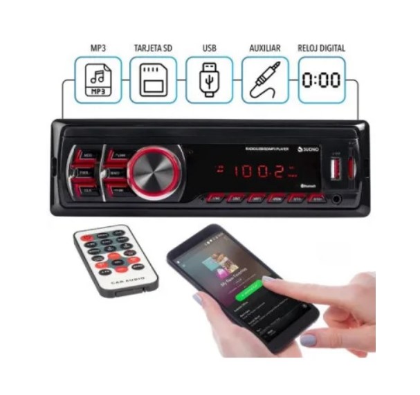 Radio digital multifunción con Bluetooth, micrófono manos libres y soporte para MP3. Reproduce desde USB, SD y AUX, con pantalla LCD retroiluminada y radio FM con almacenamiento para 18 estaciones. Incluye control remoto y funciones adicionales como reloj digital y ecualizador incorporado. Compacta y versátil para disfrutar de música y llamadas en el auto.