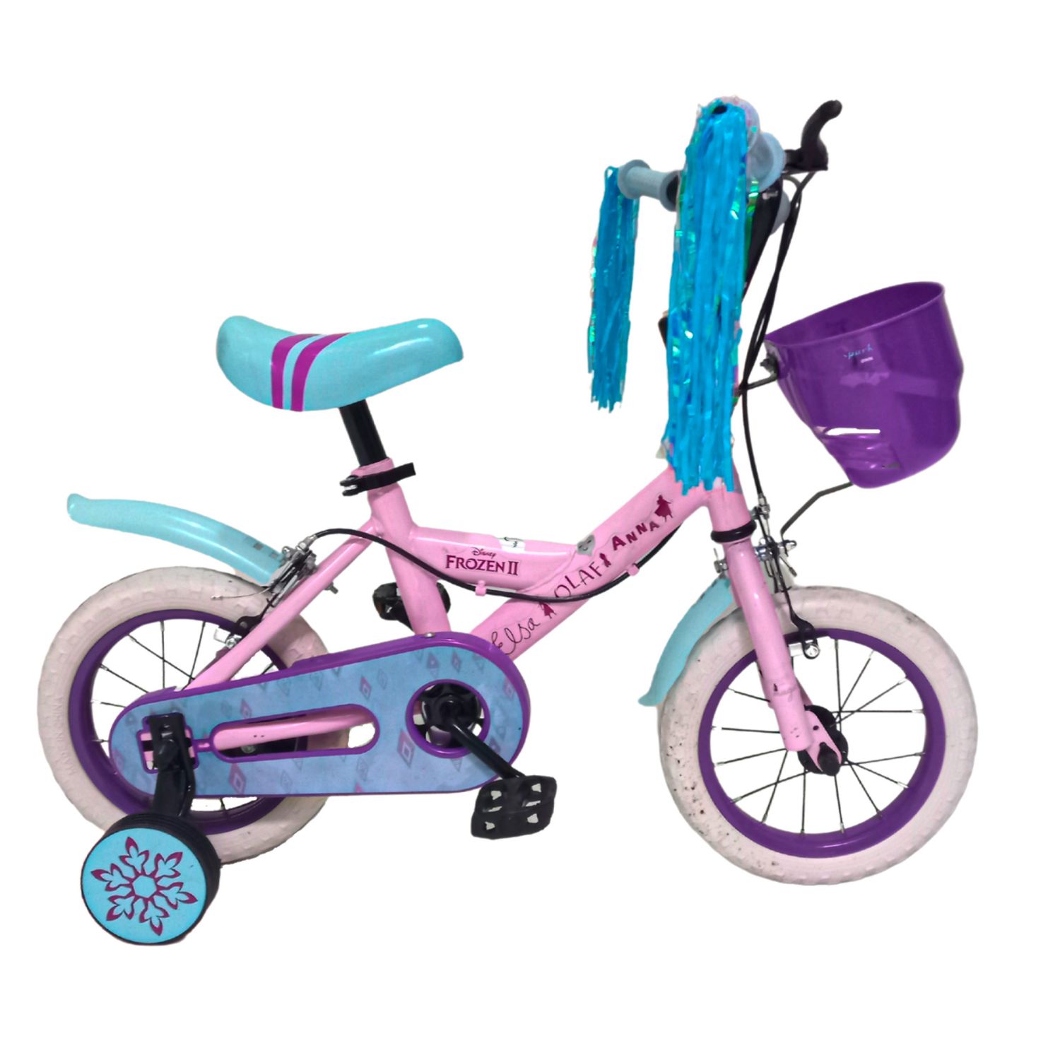 Bicicleta rodado 12″ Material: Acero Ruedas de Goma Cubre Cadena Con canasto delantero Con rueditas de aprendizaje Con freno manual en el manubrio Con Guardabarros Con timbre y cordones decorativos en el manubrio