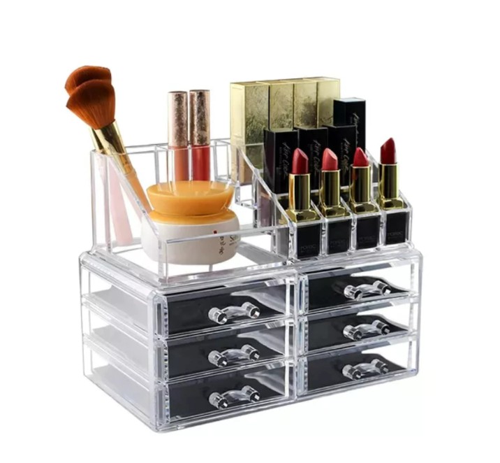 Organizador de maquillaje acrilico con 5 cajones, 21 compartimientos. Medidas: 22cm x17,5cm x13 cm