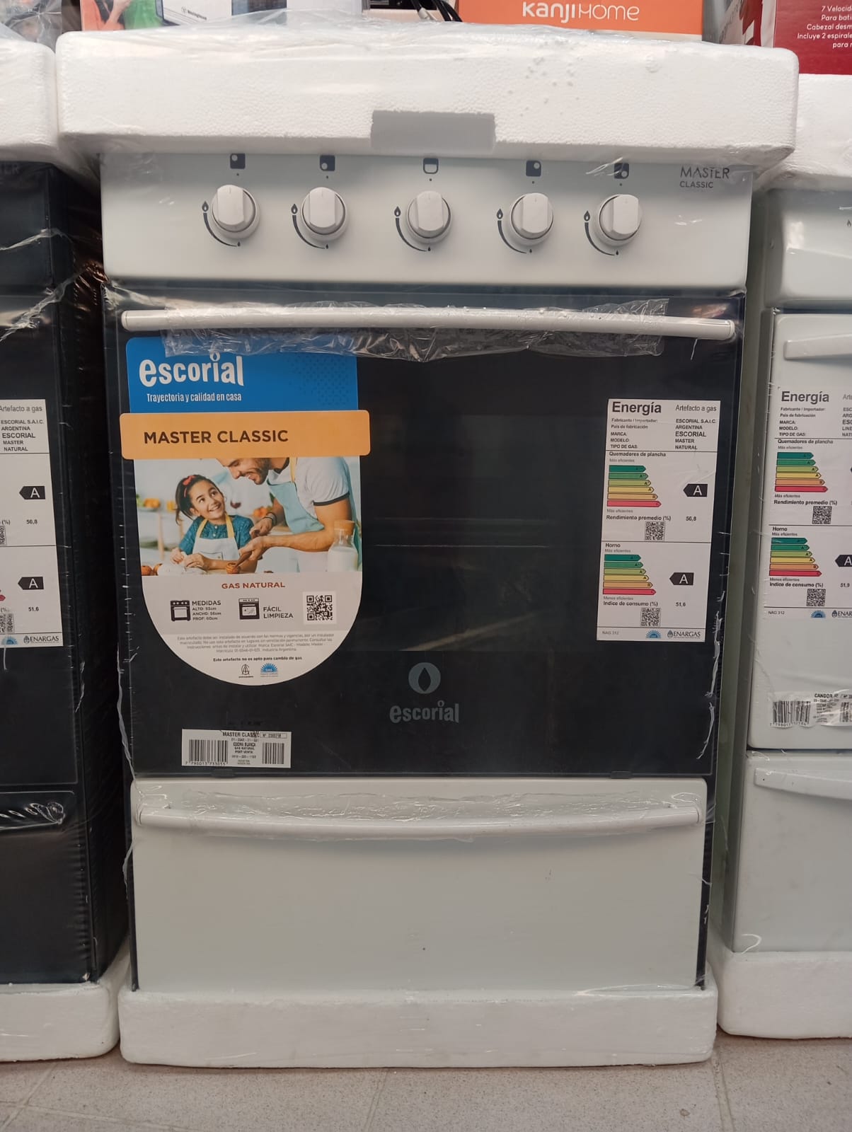 Tipo de gas: G/N Tipo de puerta del horno: Con visor Cocina de pie. Tipo de alimentación: gas. Posee 4 hornallas. Dimensiones: 565 mm de ancho, 930 mm de alto y 620 mm de profundidad.