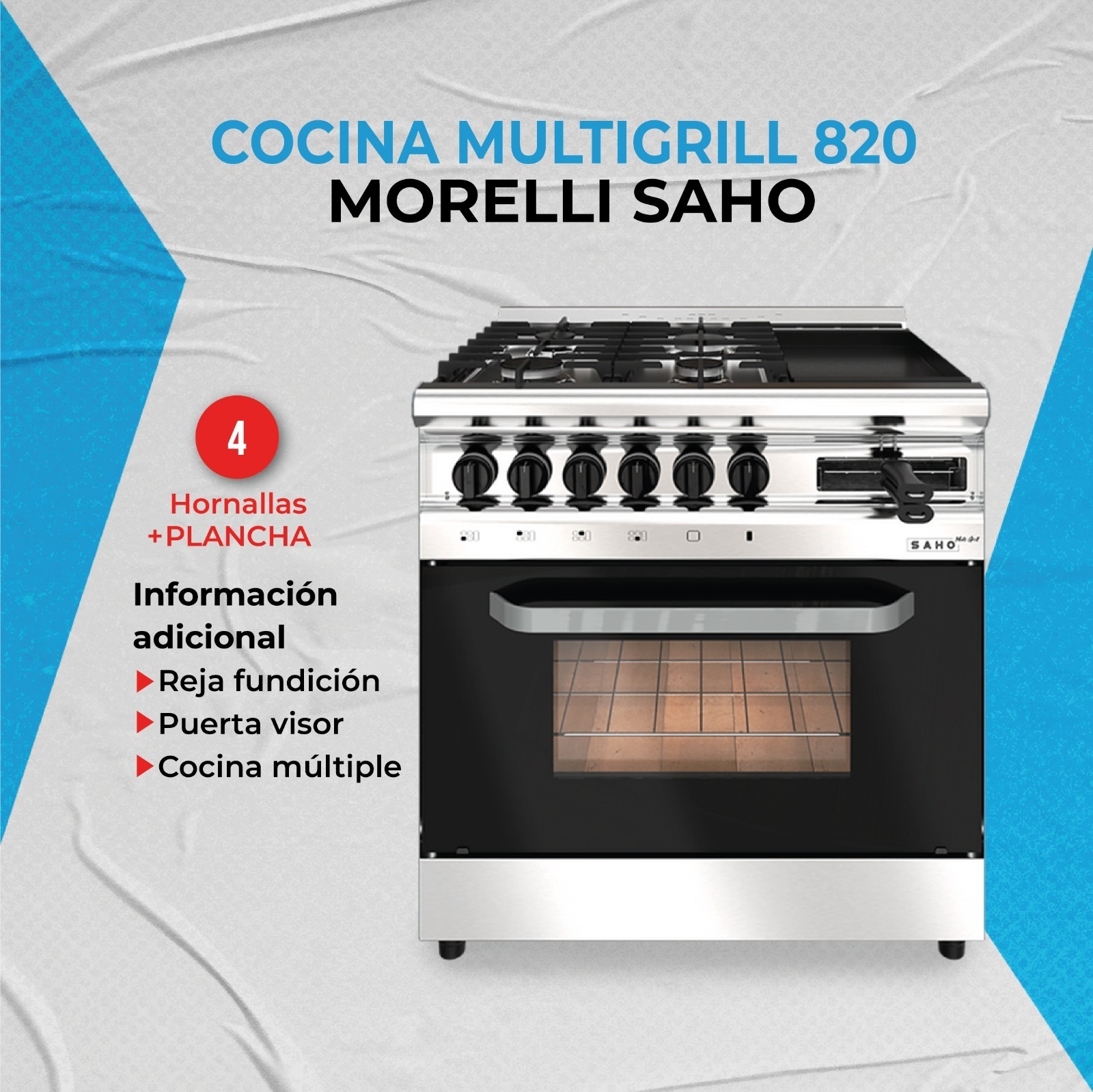 Tipo de gas: Multigas Cocina de pie. Posee 5 hornallas. Capacidad: 80L. Tipo de encendido: Manual. Dimensiones: 82cm de ancho, 85cm de alto y 62cm de profundidad