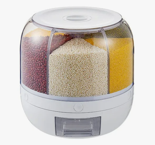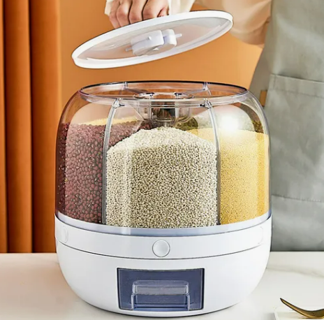 * 6 compartimientos * Almacena diversos alimentos secos como arroz, granos, legumbres, frutos secos, semillas, etc * Sistema de bandeja extraible * Proteccion contra la humedad * Dispenser con boton