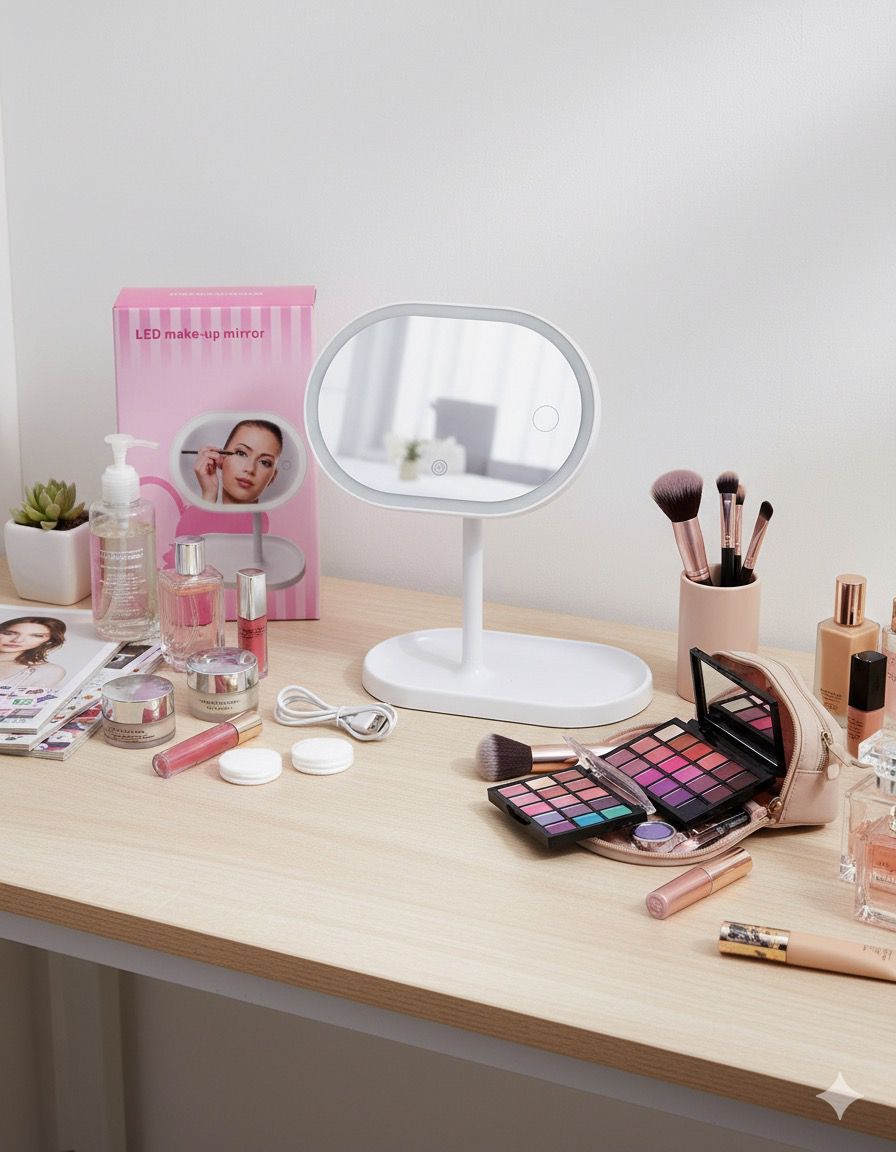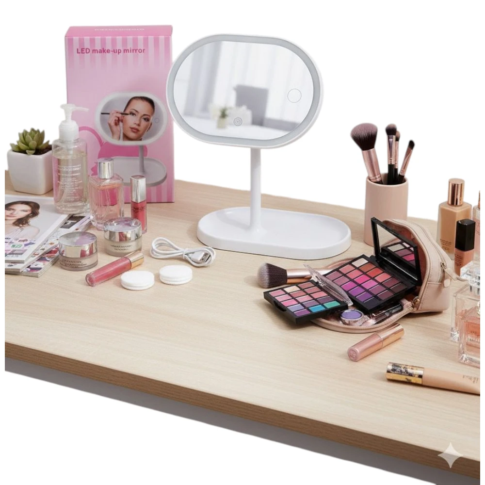 Este espejo combina diseño moderno, practicidad y tecnología para que tengas la mejor luz en cualquier momento. Ideal para maquillaje, skincare o retoques diarios.