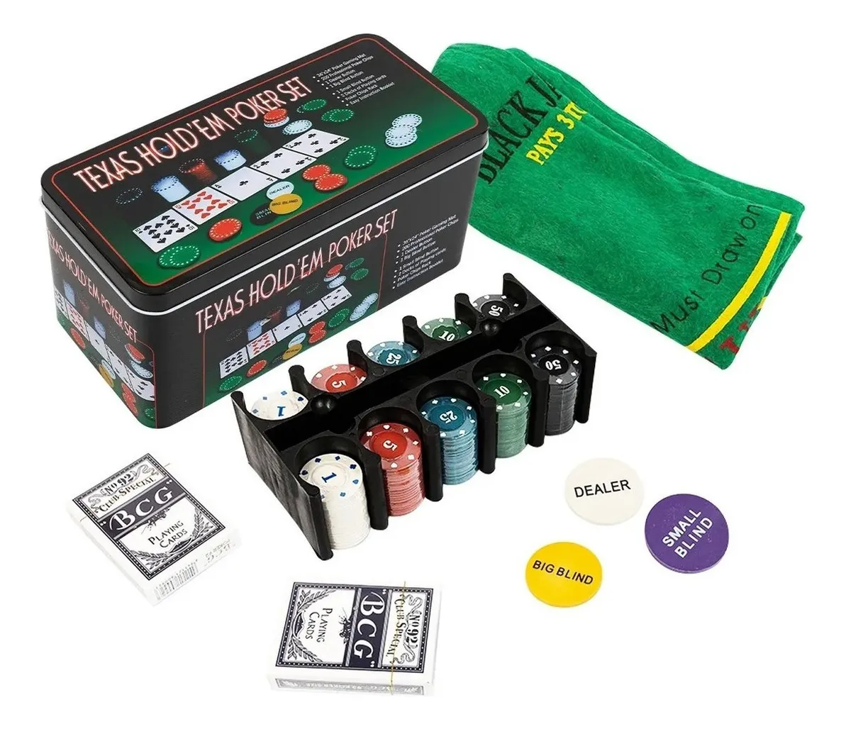 – Juego de póquer de 200 piezas: este juego de póquer cuenta con todo lo que pueda necesitar para llevar la emoción de Las Vegas a su sala de estar. Incluye 200 fichas, 2 juegos de cartas, 1 botón de crupier, 1 botón de ciega grande, 1 ciega pequeña Botón, 1 tapete de póquer y un estuche de aluminio estilo casino.