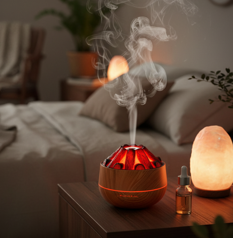 Humidificador diseño volcán con efecto de llamas realistas, ideal como elemento decorativo y para crear un ambiente cálido. Humidifica el aire y cuenta con luz LED.