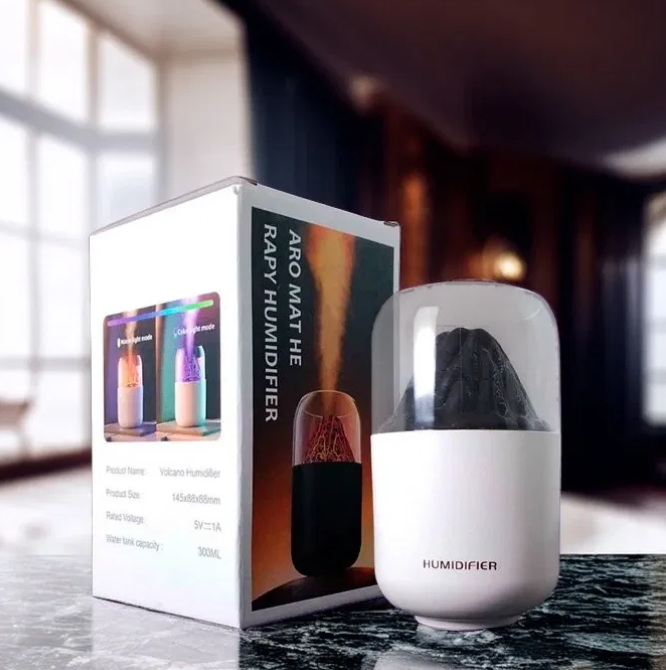 Difusor eléctrico de aromas USB Humidificador efecto volcan de mesa y escritorio. Se abre la tapa, se coloca el liquido con agua y se prende. Se usa conectado via cable usb (incluido). Incluye manual Capacidad: 300 ml