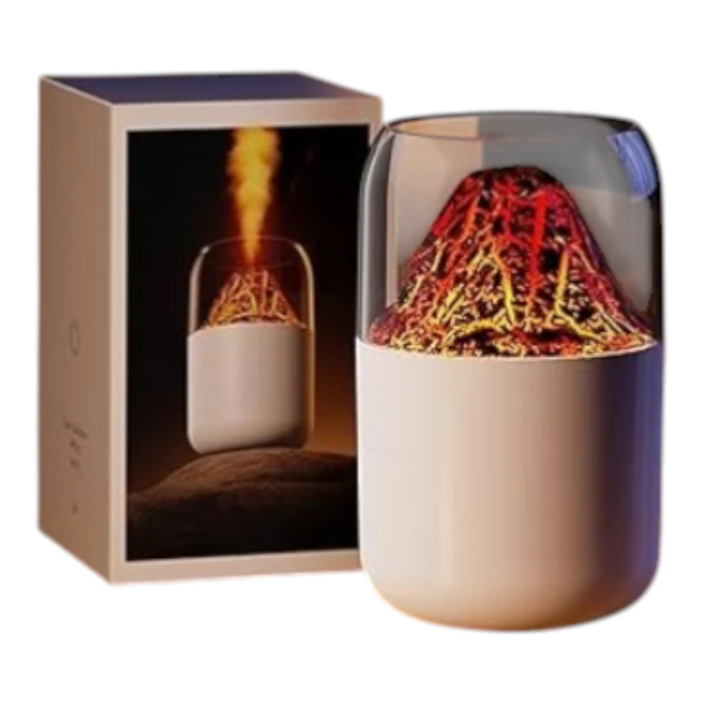 Difusor eléctrico de aromas USB Humidificador efecto volcan de mesa y escritorio. Se abre la tapa, se coloca el liquido con agua y se prende. Se usa conectado via cable usb (incluido). Incluye manual