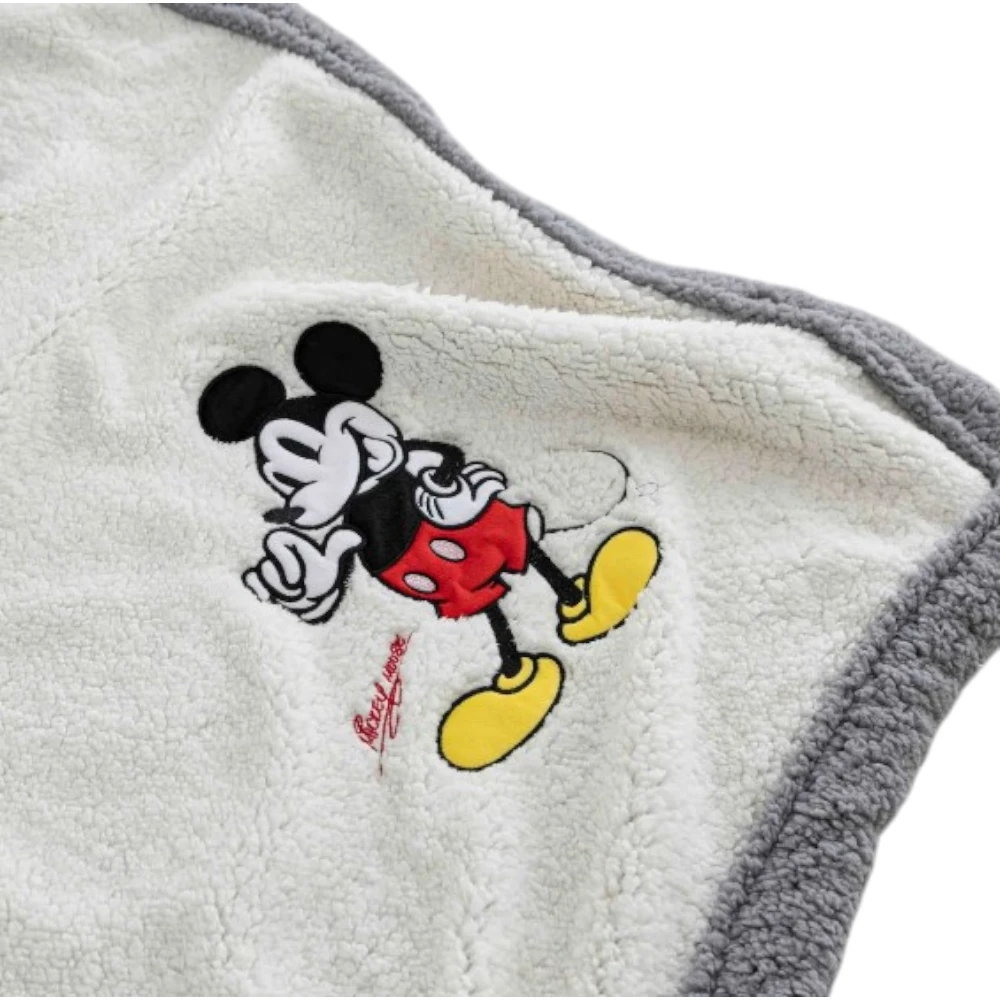 Frente tiene corderito color crema con el detalle bordado de Mickey y el reverso también es decorderito color gris.