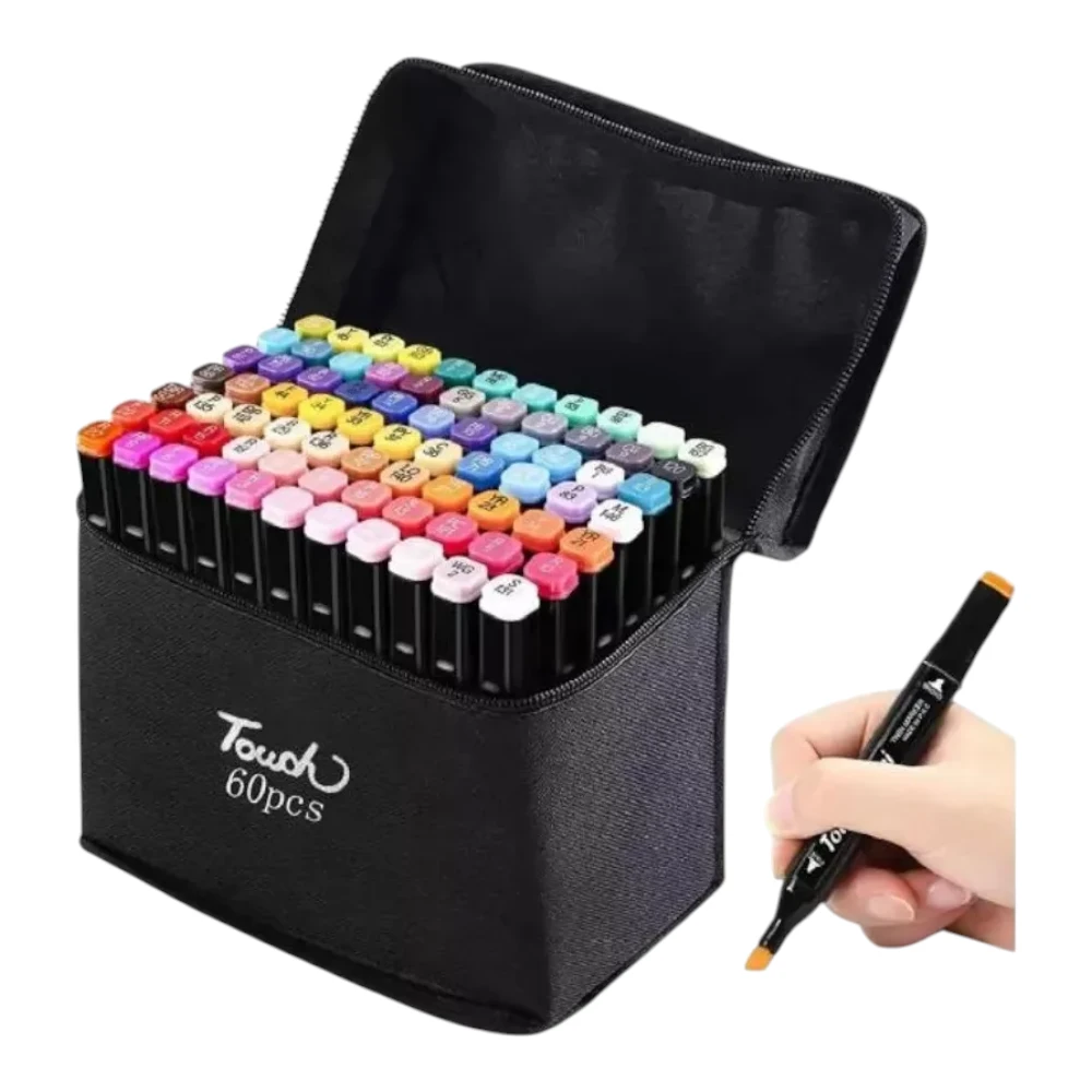 Este set de 60 marcadores de doble punta es ideal para artistas y entusiastas del dibujo. Los marcadores vienen en una variedad de colores primarios y secundarios, perfectos para dibujar, escribir, bocetar, ilustrar, sombrear, diseñar, renderizar, manga, anime, libros de colorear para adultos y mucho más. Son adecuados para usar en papel, cerámica, vidrio, madera, tela y otros materiales.
