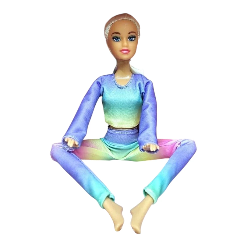 Esta simpática muñeca viene vestida con ropa deportiva y trae accesorios temáticos como mat de yoga y cartilla de posturas.