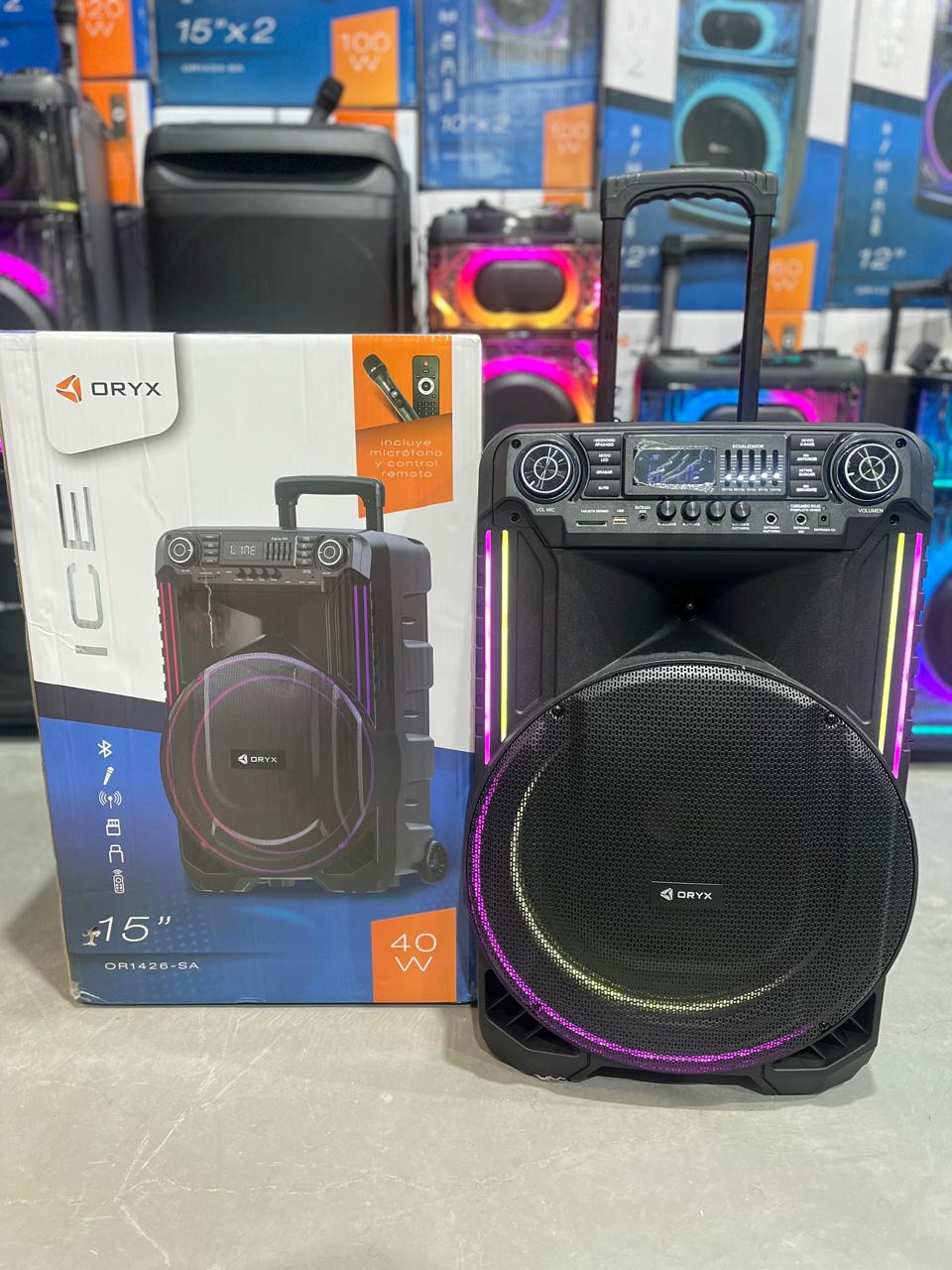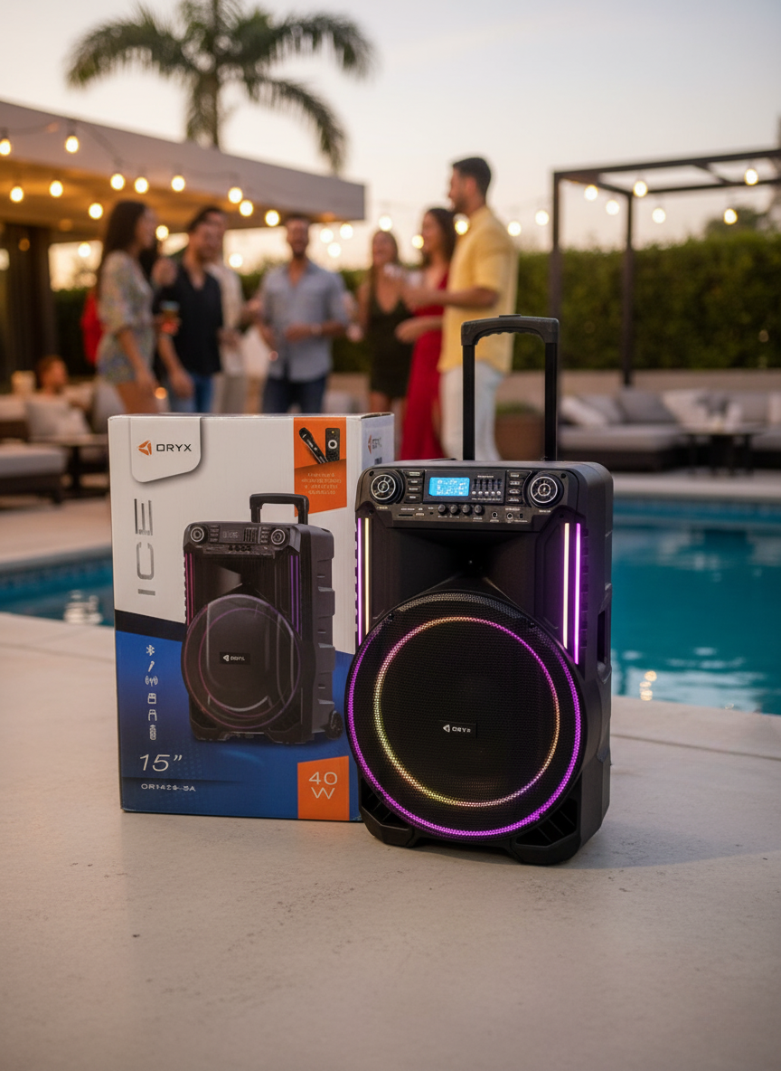 Parlante con manija y ruedas para transportar.