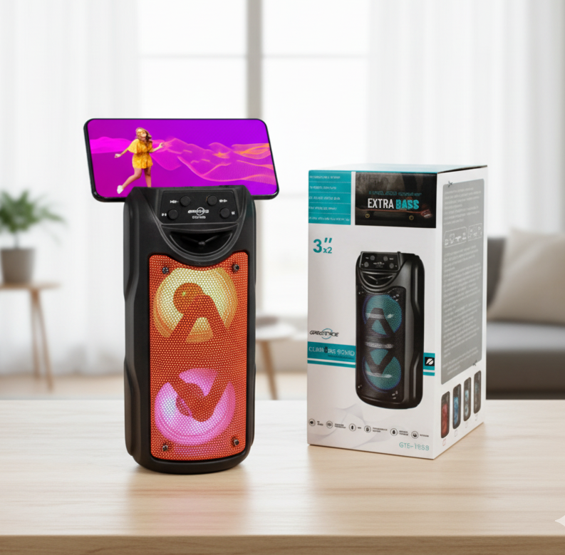 – Recargable – Radio FM – Funciona con USB y MicroSD – Bluetooth – Parlante con soporte para celular – Extra Bass