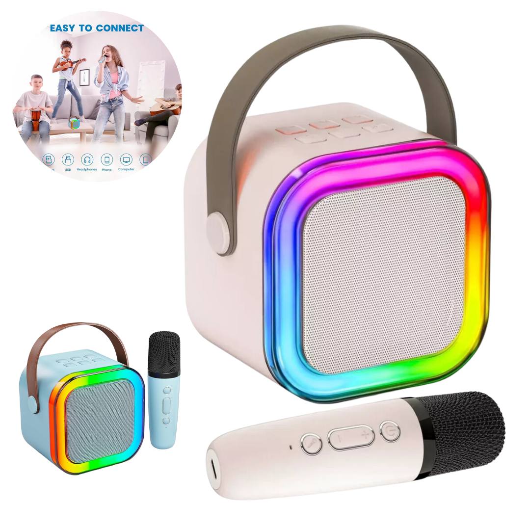 Parlante Bluetooth de alta gama Pequeño micrófono karaoke Tiene luces led Distintos efectos de voz Batería recargable Potencia de 6W