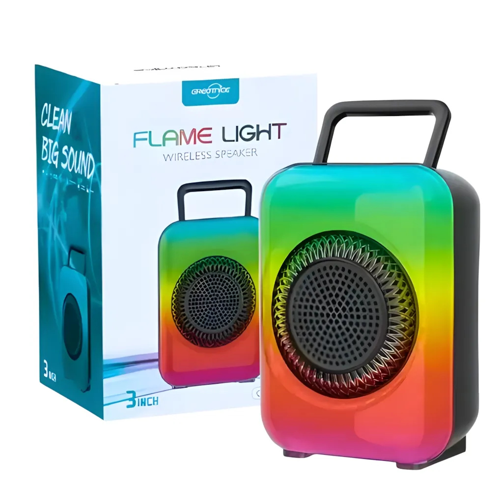 Bocina Bluetooth 3″ portátil con luces tipo llama Batería recargable Entradas USB y micro SD Incluye cable V8
