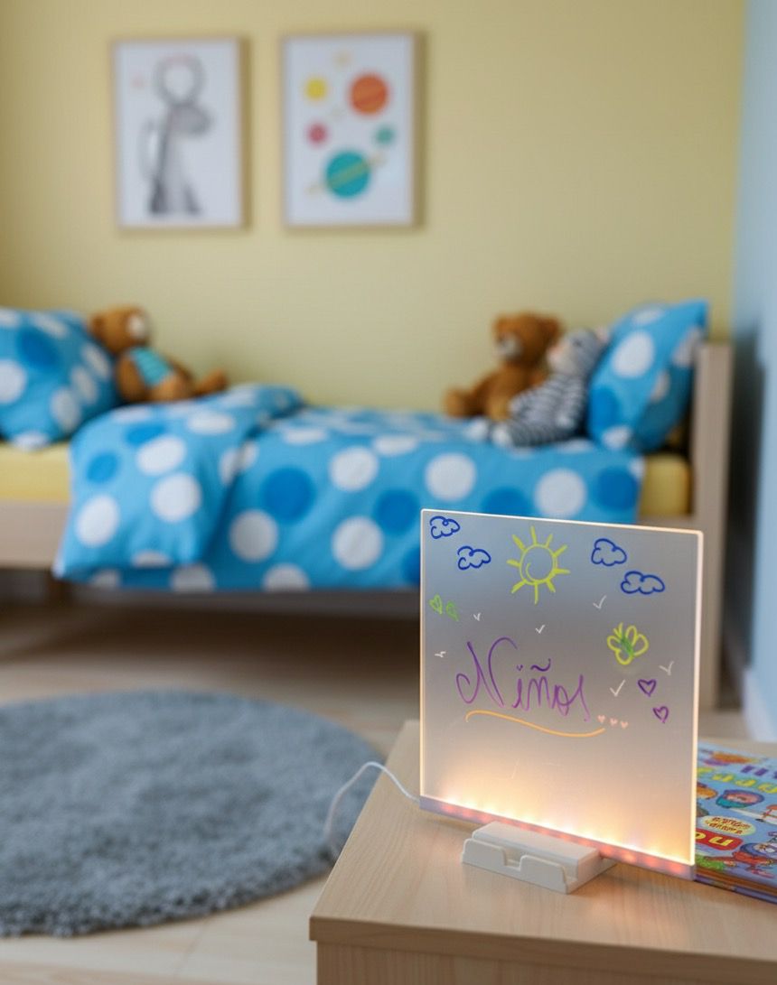 Dale un toque moderno y creativo a tu hogar, oficina o negocio con esta pizarra acrílica iluminada. Su diseño con luz LED realza los colores de los marcadores, haciendo que cada dibujo, nota o mensaje brille con estilo.