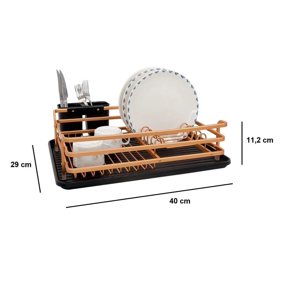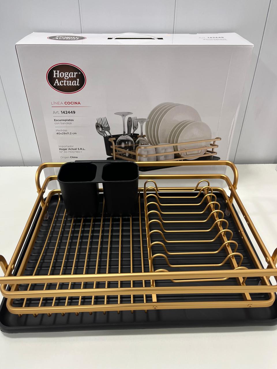 Marca Hogar Actual Color: Bronce, Negro Dimensiones: 40 cm x 29 cm x 11.2 cm Características Cantidad de niveles: 1 | Con cubiertero Capacidad: 11 Platos Material: Aluminio | PVC