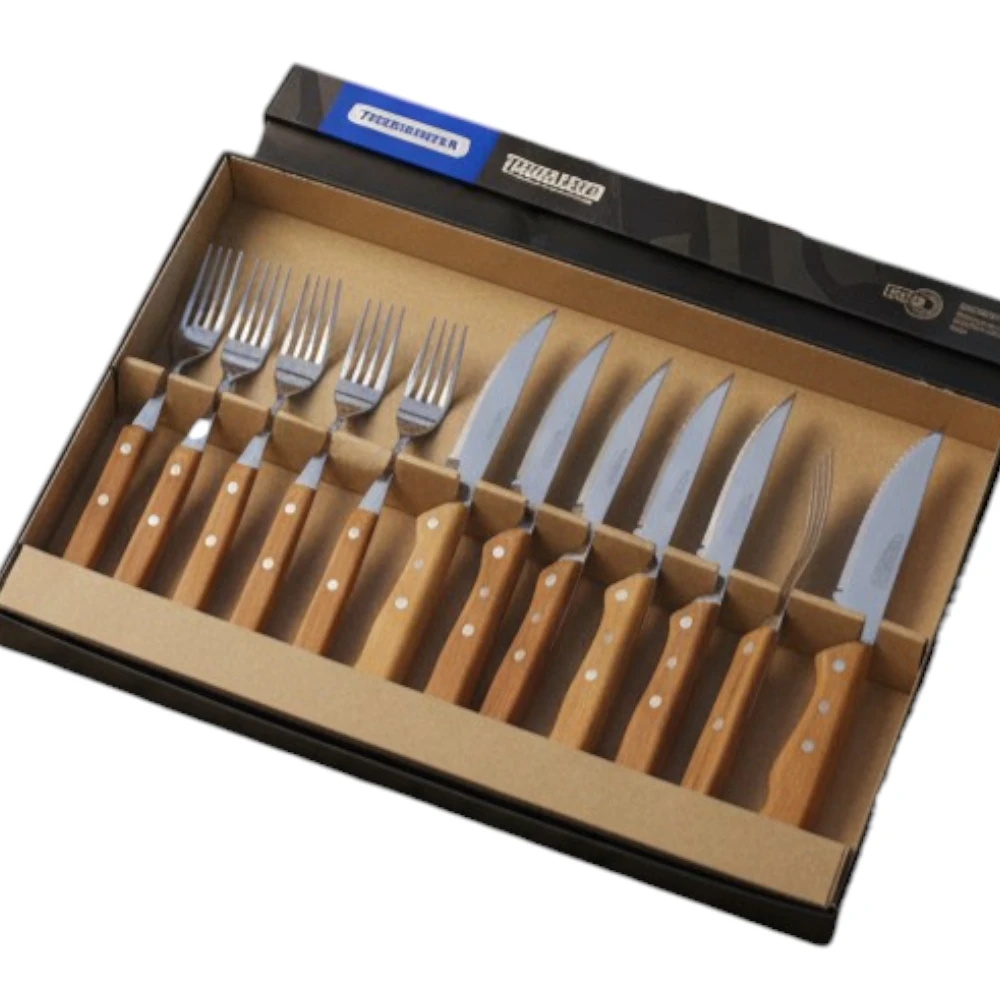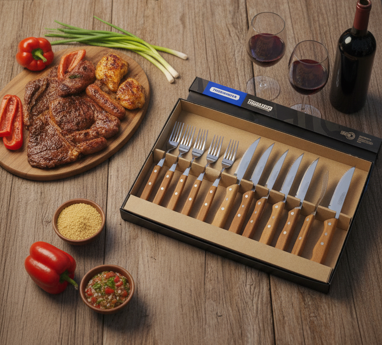 Transforma tus asados en una experiencia gourmet con el Juego de 12 Cubiertos Tramontina Churrasco. Este conjunto incluye 6 cuchillos jumbo y 6 tenedores jumbo, diseñados para ofrecer un corte preciso y una sujeción cómoda. La hoja de acero inoxidable garantiza durabilidad y resistencia, mientras que el mango de madera aporta un toque de elegancia y calidez a tu mesa.