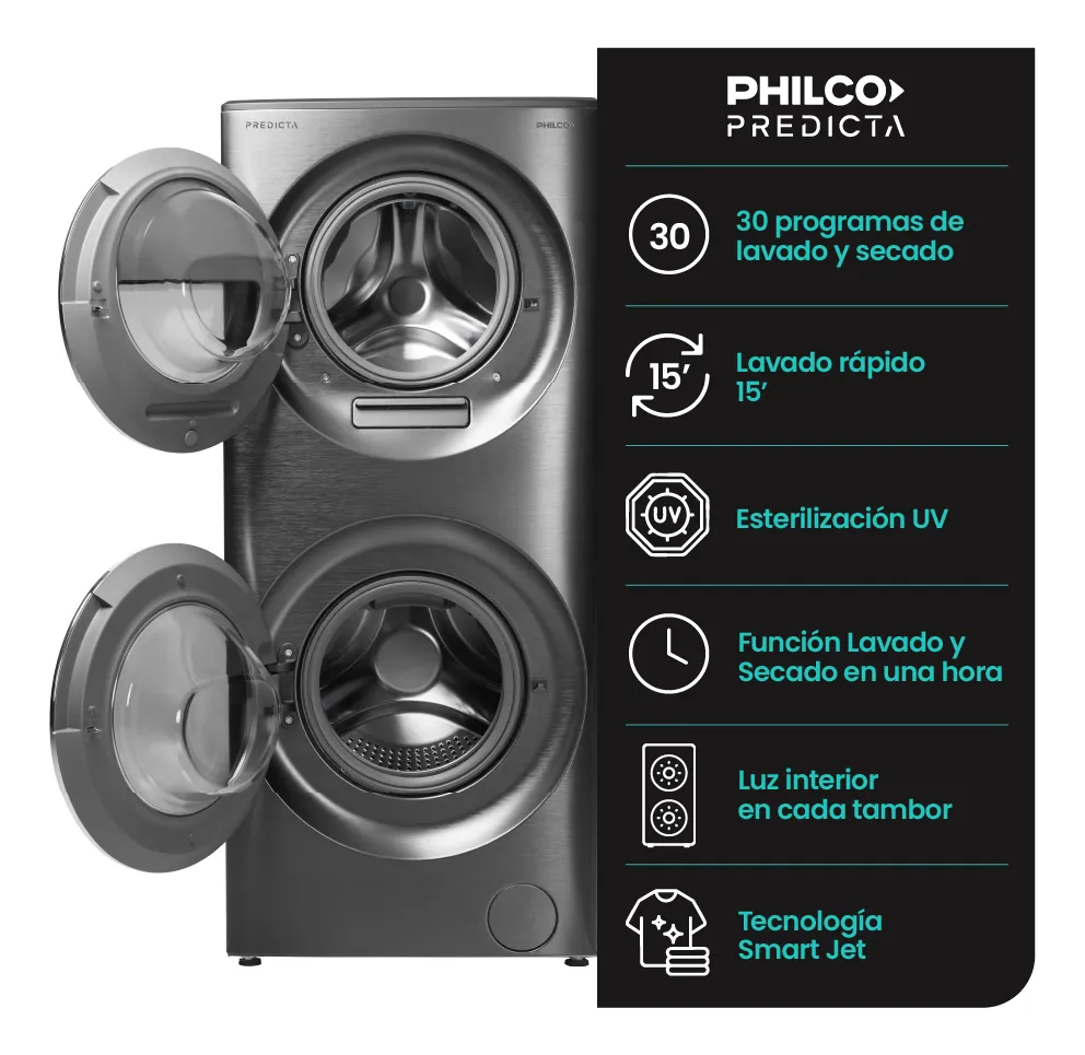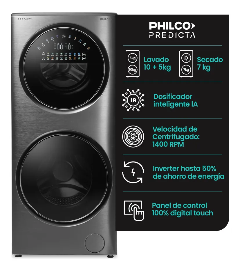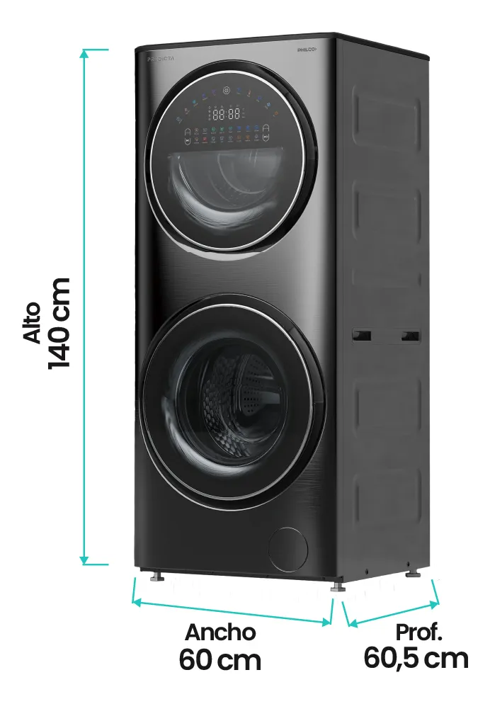 Sumergite en un mundo de comodidad y tecnología con la Torre de Lavado Philco. Este innovador electrodoméstico cuenta con un lavarropas en la parte superior y un lavasecarropas en la parte inferior, ambos frontales y con un elegante acabado en acero inoxidable negro. La combinación perfecta de eficiencia y estilo hará de tus días de lavado una experiencia rápida y simple.