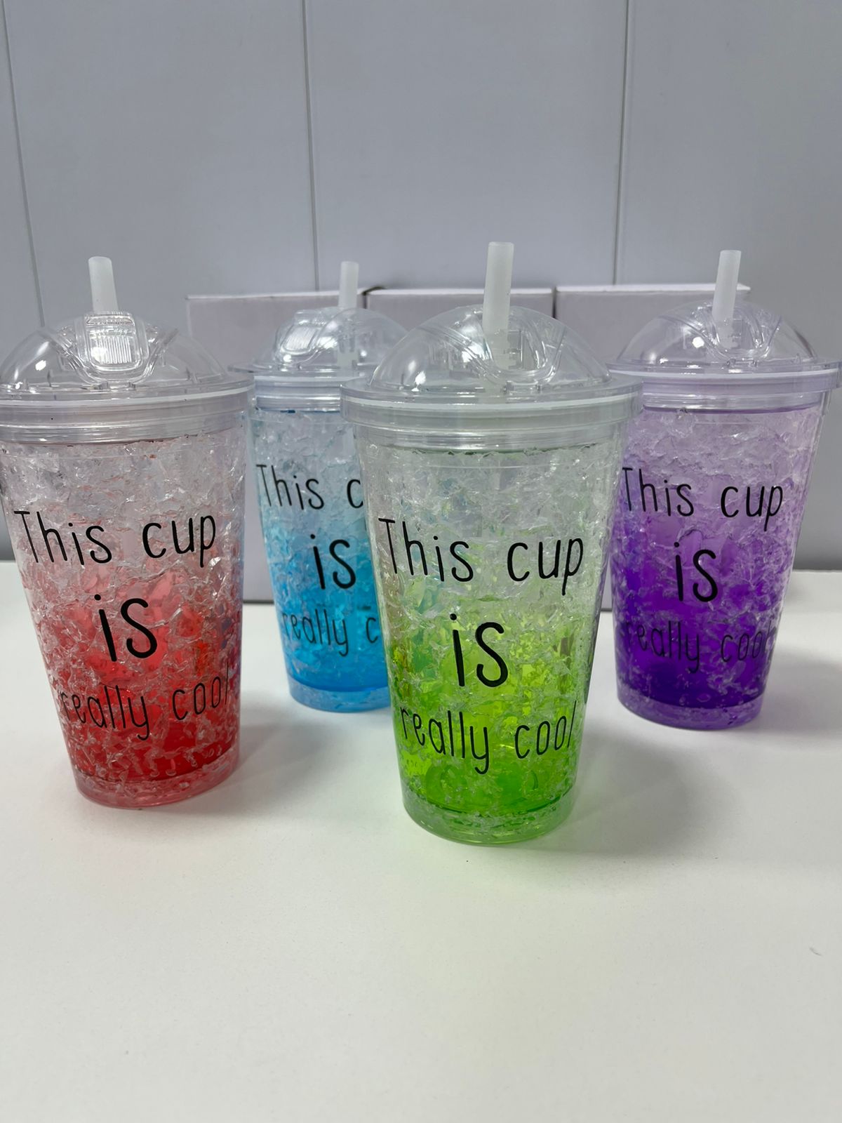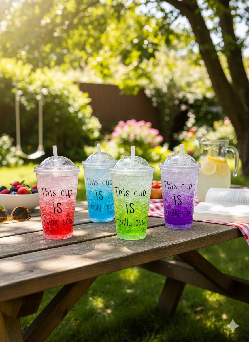 Vaso de plástico de doble pared con gel refrigerante, ideal para mantener tus bebidas frías por más tiempo. Diseño atractivo con sorbete incluido para mayor comodidad. Capacidad: 450 ml.